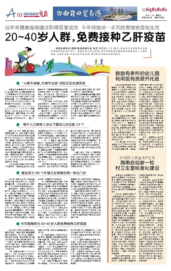 今年,海南将开展新生儿多种疾病代谢筛查;为20~40岁人群免费接种乙肝疫苗;对认知障碍老年人、孤独症儿童进行数字疗法干预,普及应急救护知识;完善生育支持措施,新增幼儿托位6250个。