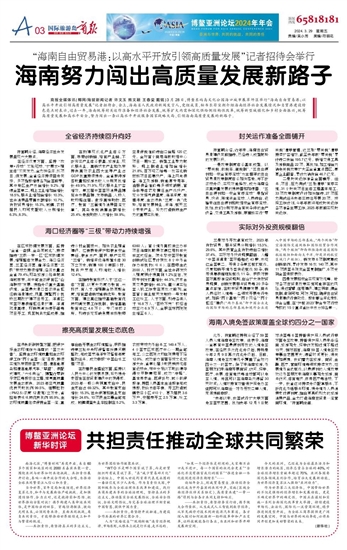 商报全媒体讯(椰网/海拔新闻记者 许文玉 熊文颖 王春棠 戴铭)3月28日,博鳌东屿岛文化公园海口城市展草坪区举行“海南自由贸易港:以高水平开放引领高质量发展”记者招待会。会上,海南省人民政府新闻发言人,党组成员、秘书长符宣朝介绍海南经济社会发展情况和自贸港建设特色亮点时表示,过去一年,海南统筹封关运作准备和经济社会发展,统筹扩大内需和深化供给侧结构性改革,统筹新型城镇化和乡村全面振兴,统筹高质量发展和高水平安全,努力闯出一条以高水平开放服务国家战略大局、引领海南高质量发展的新路子。