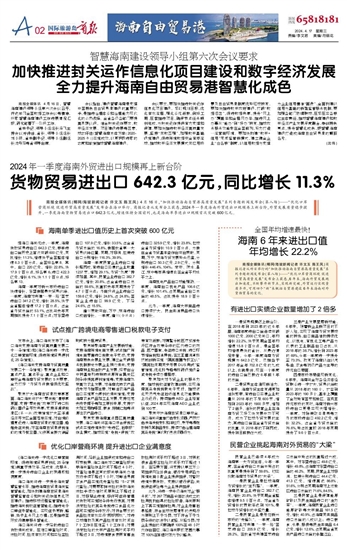 一是贸易规模迈上新台阶。在2018年到2023年的这6年里,海南年度进出口值连续突破1000亿元、2000亿元关口,年均增长22.2%,快于同期全国年均增速15.8个百分点,是全国年均增速最快的省份。从最近情况来看,今年一季度海南外贸规模为642.3亿元,已相当于2017年全年702.8亿元的九成以上,也就是说,现在一个季度的进出口值已接近6年前1年的总值。