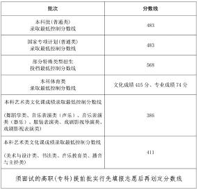 另外,国家专项计划(普通类)录取最低控制分数线为483分;部分特殊类型招生投档最低控制分数线为568分;本科体育类录取最低控制分数线文化成绩415分、专业成绩74分;本科艺术类文化课成绩录取最低控制分数线[舞蹈学类、音乐表演类(声乐)、音乐表演类(器乐)、服装表演类、戏剧影视导演类、戏剧影视表演类]386分;本科艺术类文化课成绩录取最低控制分数线(美术与设计类、书法类、音乐教育类、播音与主持类)411分。