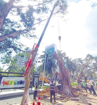 12日上午9时左右,一辆黑色的挖机驶进榕树旁边的电动车道,在榕树近1米处停了下来。一辆黄色的吊车在榕树对面的马路上停了下来,中间隔着一个电动车道、一个绿化带和一个公交站亭。