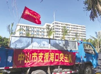 9月12日16时,记者在海口龙华区龙昆北路看到一支“粤T”车牌的队伍,车辆插着飘扬的红旗上写着“中山市救援突击队”,他们身着红白马甲,脸上挂满岁月的痕迹,干起活来丝毫不松懈。