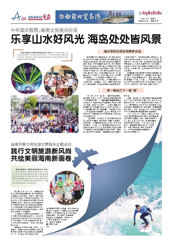 此外,10月7日,记者从飞猪平台发布的《2024国庆假期出游快报》显示,国庆黄金周旅游消费热情高涨。其中,海南旅游持续火热。海口、三亚、万宁、陵水、琼海是海南省旅游预订最热的城市。广东、浙江、上海、四川、湖南等是海南旅游的热门客源地。浮潜、游艇出海、海钓、直升机观光、日月湾冲浪等富有海南特色的体验深受消费者欢迎。
