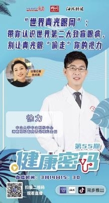 为了提高公众对青光眼的认识,了解更多关于青光眼防范的科学知识。3月14日15时30分,国际旅游岛商报社《健康密码》第五十五期特邀中山大学中山眼科中心海南眼科医院青光眼科主任徐力做客直播间,为大众进行预防青光眼相关知识的线上解答。