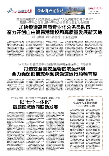 冯飞指出,要深入贯彻习近平总书记关于建设人民满意的公务员队伍的重要论述、关于加强海南干部队伍建设的重要指示精神,聚焦新征程目标任务,把握公务员建设规律,加快锻造一支让党放心、让人民满意、堪当自贸港建设重任的高素质专业化公务员队伍。