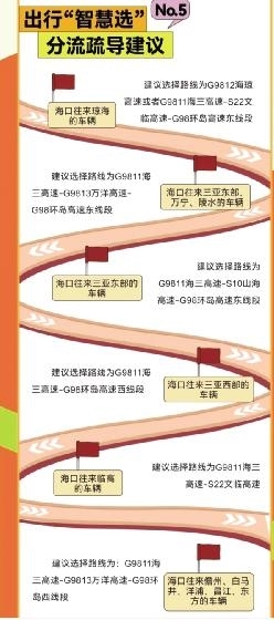 根据历年中秋国庆假期前后数据分析,9月30日14时-21时,海口出城方向的高速公路将不定期出现拥堵。10月1日-8日9时-12时,三亚大茅隧道出城方向的高速公路将不定期出现拥堵,10时-20时,三亚大茅隧道进城方向的高速公路将不定期出现拥堵。10月8日15时-20时,海口、三亚进城方向的高速公路将不定期出现拥堵。9月30日-10月8日期间,G98环岛高速龙桥立交—美玉枢纽段、三亚大茅隧道段、三亚绕城段、白莲互通-美台互通段的交通压力都将持续处于高位。
