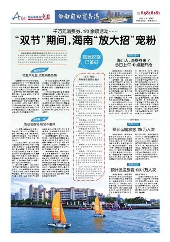 继暑期4000万元旅游补贴后,海南在国庆中秋“双节”期间再加码2000万元消费支持。10月1日至10月15日,游客只需登录“酷游海南”平台或“海易办”、“云闪付”APP ,进入消费券专区,即可领取机票、酒店、景区、餐饮、免税等消费券,尽享“惠游海南”的乐趣。