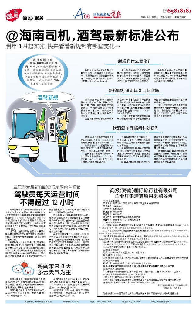 - @海南司机,酒驾最新标准公布 商报全媒体讯(椰网/海拔新闻记者 郭尚)近日,酒驾最新检验标准发布。新检验标准将血液和尿液中乙醇的检测方法分为两种,分别是气相色谱法和电化学传感器法。该标准将于2024年3月1日起实施。 新规