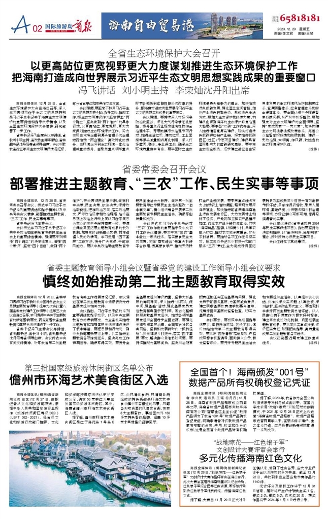 - 以更高站位更宽视野更大力度谋划推进生态环境保护工作把海南打造成向世界展示习近平生态文明思想实践成果的重要窗口 商报全媒体讯 12月28日,全省生态环境保护大会在海口召开,深入学习贯彻习近平生态文明思想特别是习近平总书记关于海南生态文明建设的重要讲话和指示批示精神,以及全国生态环境保护大会精神,研究部署下一