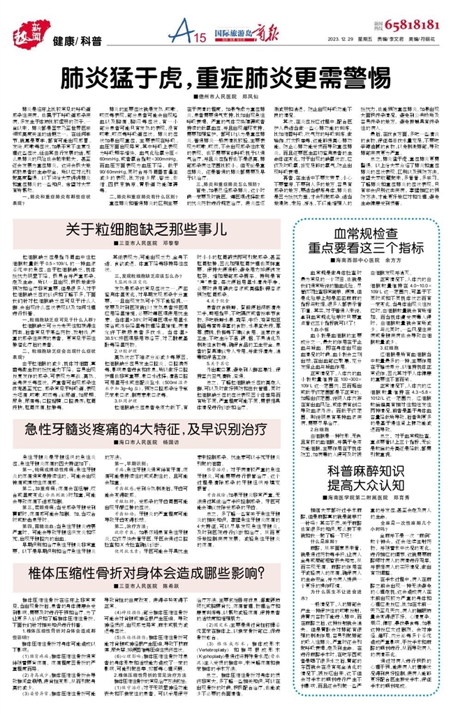 - 血常规检查重点要看这三个指标 ■海南西部中心医院 余方方 血常规是做身体检查时最为常见的一个项目,也就是我们通常所说的抽血化验。尽管该项检查非常简单、便捷,但是化验单上却是密密麻麻的指标与数据,很多人都表示看不懂。其实