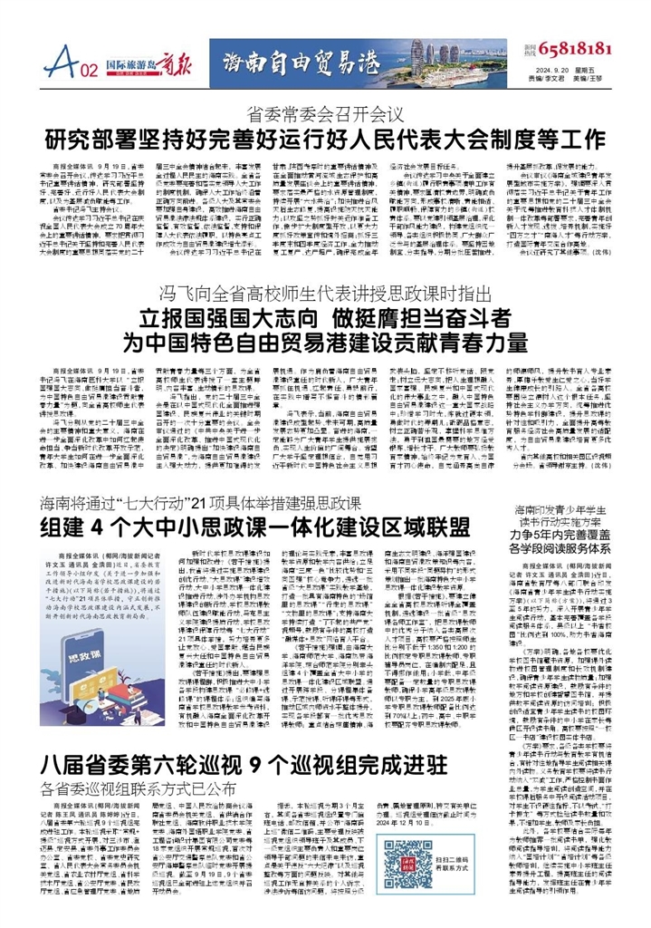 - 立报国强国大志向 做挺膺担当奋斗者 为中国特色自由贸易港建设贡献青春力量 商报全媒体讯 9月19日,省委书记冯飞在海南医科大学以“立报国强国大志向、做挺膺担当奋斗者,为中国特色自由贸易港建设贡献青春力量”为题,向全省高校师生代表讲授思政课。 冯飞分别从党的二十届三