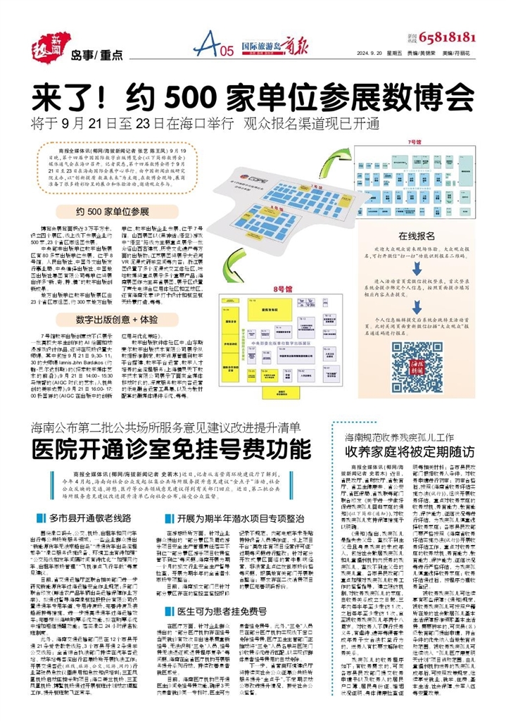 - 医院开通诊室免挂号费功能 商报全媒体讯(椰网/海拔新闻记者 史若木)近日,记者从省营商环境建设厅了解到,今年4月起,海南向社会公众发起征集公共场所服务提升意见建议“金点子”活动,社会公众反映的交通、游憩、医疗等公共领域意见
