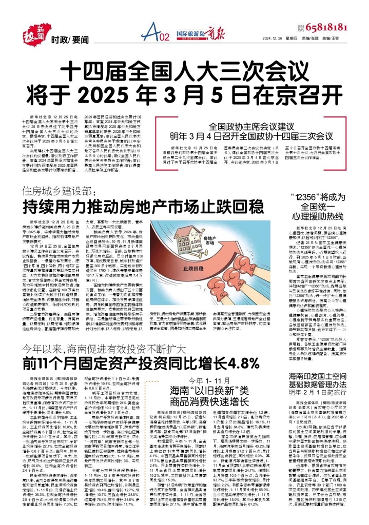 - 前11个月固定资产投资同比增长4.8% 商报全媒体讯(椰网/海拔新闻记者 柯育超) 12月25日,记者从海南省统计局获悉,今年以来,海南通过加快超长期特别国债和地方政府专项债发行使用,聚焦灾后恢复重建,促进有效投资不断扩大。1-11月份