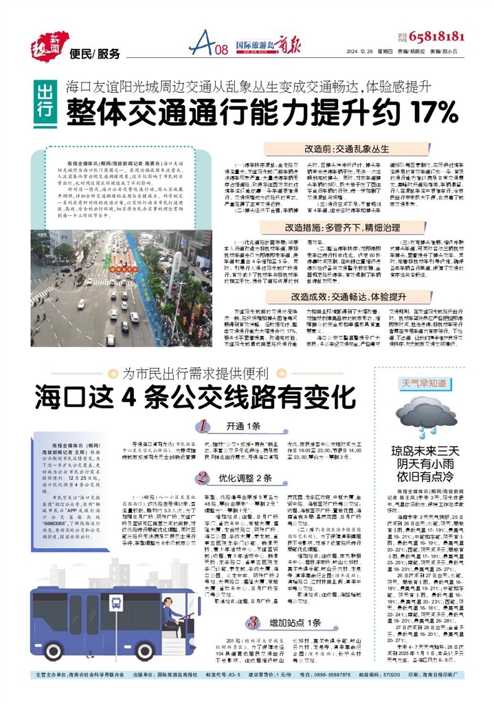 - 整体交通通行能力提升约 17% 商报全媒体讯(椰网/海拔新闻记者 陈勇合)海口友谊阳光城作为海口热门商圈之一,其周边路段因车流量大、人流密集而常出现交通拥堵现象,这不仅影响了市民的日常出行,也对周边商业环境造成了不利影响。