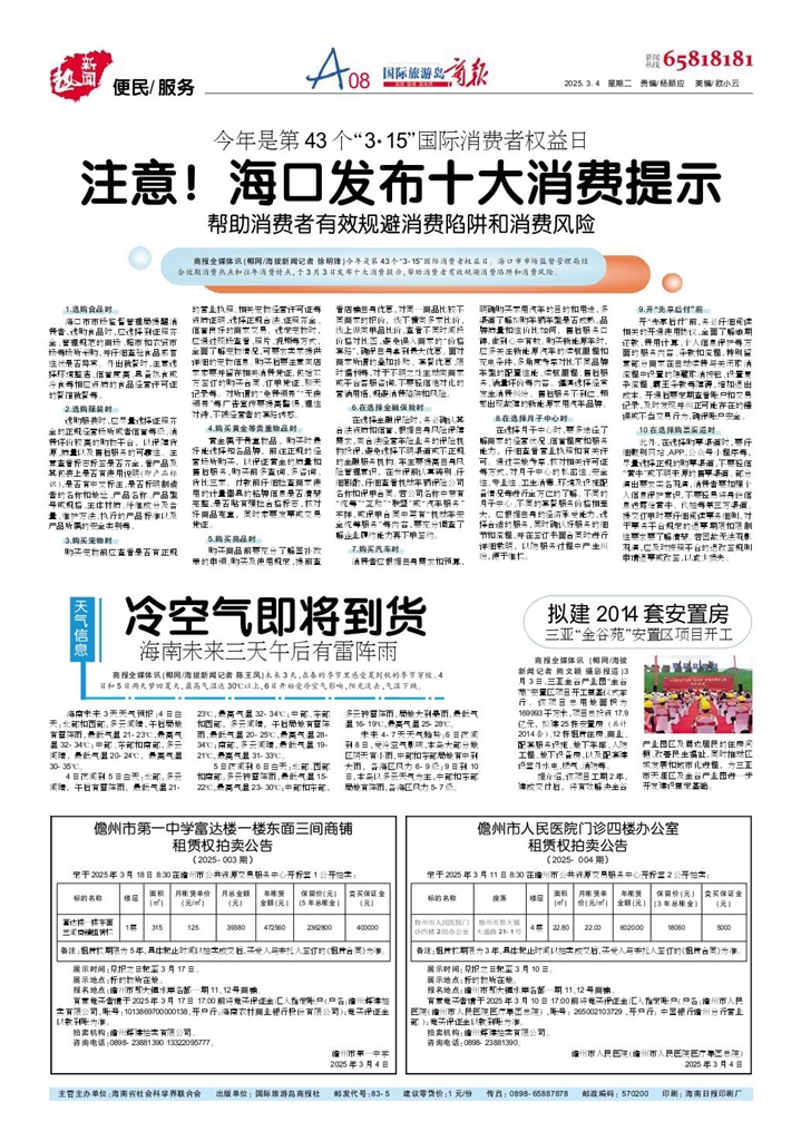 - 注意!海口发布十大消费提示 商报全媒体讯(椰网/海拔新闻记者 徐明锋)今年是第43个“3·15”国际消费者权益日。海口市市场监督管理局结合近期消费热点和往年消费特点,于3月3日发布十大消费提示,帮助消费者有效规避消费陷阱和消