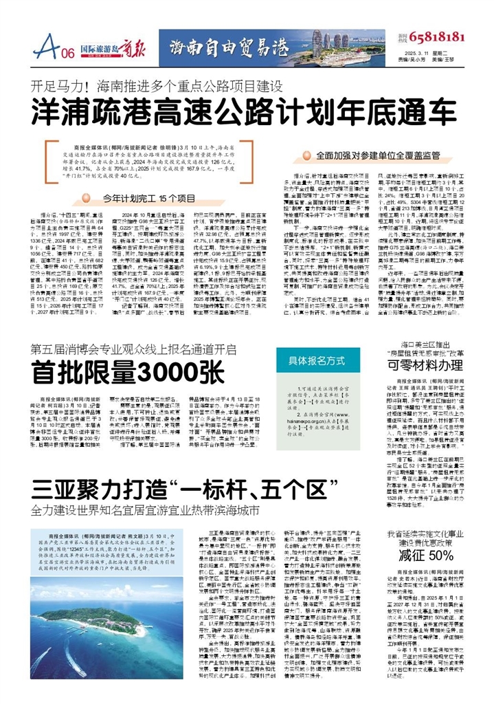 - 洋浦疏港高速公路计划年底通车 商报全媒体讯(椰网/海拔新闻记者 徐明锋)3月10日上午,海南省交通运输厅在海口召开全省重点公路项目建设推进暨质量提升年工作部署会议。记者从会上获悉,2024年海南交投完成交通投资126亿元,增长