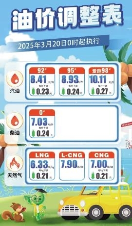 调整后,92#汽油每升8.41元,每升下调0.23元;95#汽油每升8.93元,每升下调0.24元;0#柴油每升7.03元,每升下调0.24元。