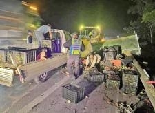 商报全媒体讯(椰网/海拔新闻记者 黄桂风 通讯员 冯品婷)3月24日凌晨3时许,G98海南环岛高速西线三亚往海口方向499公里处发生惊险一幕:一辆满载贵妃芒果的小型货车因操作不当发生侧翻,芒果和物流筐倾覆路面,占据两条车道,后方车辆紧急避让,现场险象环生。儋州市公安局交警支队高速公路管理大队接警后迅速行动,仅用1小时完成救援并恢复交通。