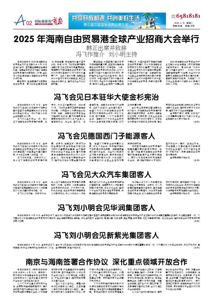 - 2025年海南自由贸易港全球产业招商大会举行 商报全媒体讯 2025年海南自由贸易港全球产业招商大会4月14日在海口举行。国家副主席韩正出席并致辞。海南省委书记冯飞推介海南自由贸易港建设成果和核心政策,省长刘小明主持并推介海南自由贸易港投资环
