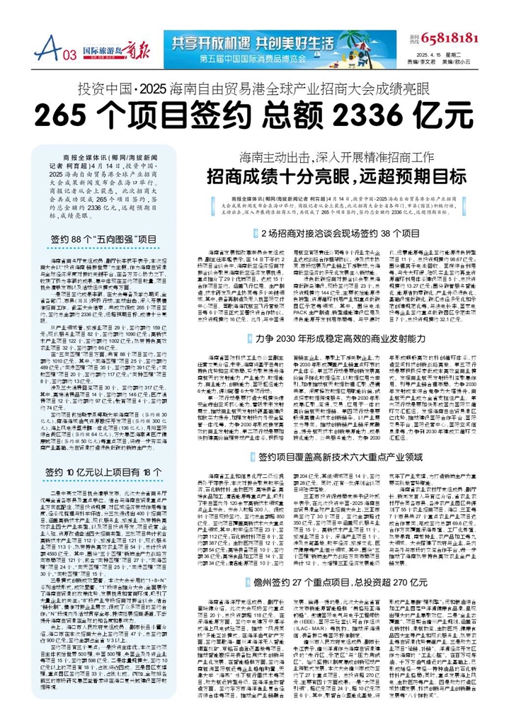 商报全媒体讯(椰网/海拔新闻记者 柯育超)4月14日,投资中国·2025海南自由贸易港全球产业招商大会成果新闻发布会在海口举行。商报记者从会上获悉,此次招商大会共成功促成265个项目签约,签约总金