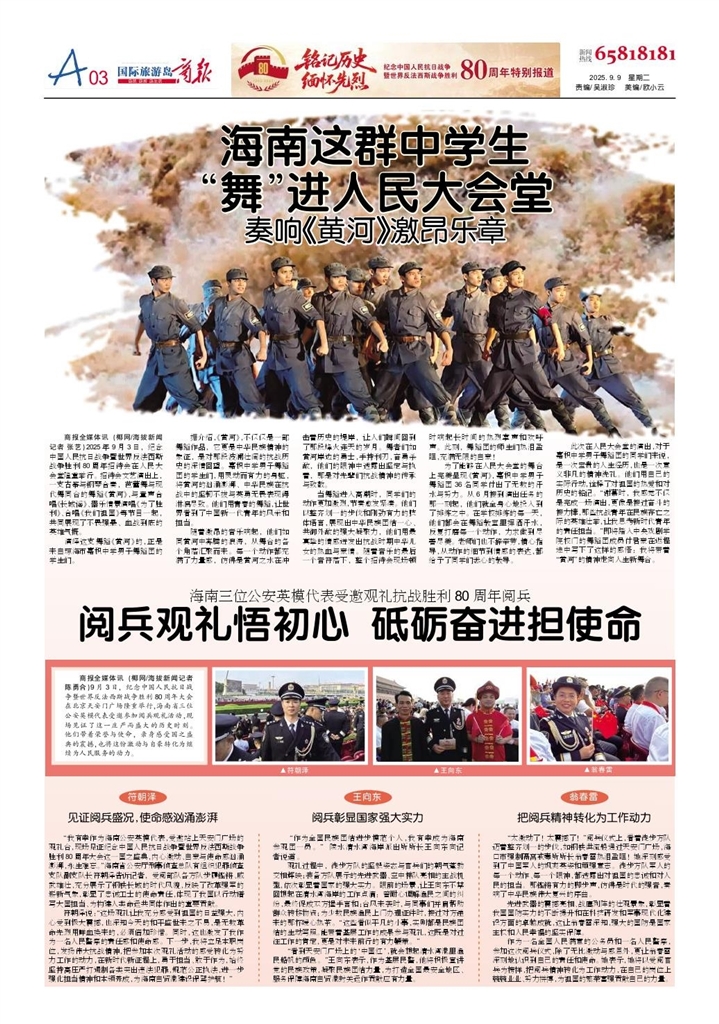 商报全媒体讯(椰网/海拔新闻记者 陈勇合)9月3日,纪念中国人民抗日战争暨世界反法西斯战争胜利80周年大会在北京天安门广场隆重举行,海南省三位公安英模代表受邀参加阅兵观礼活动,现场见证了这一庄严而