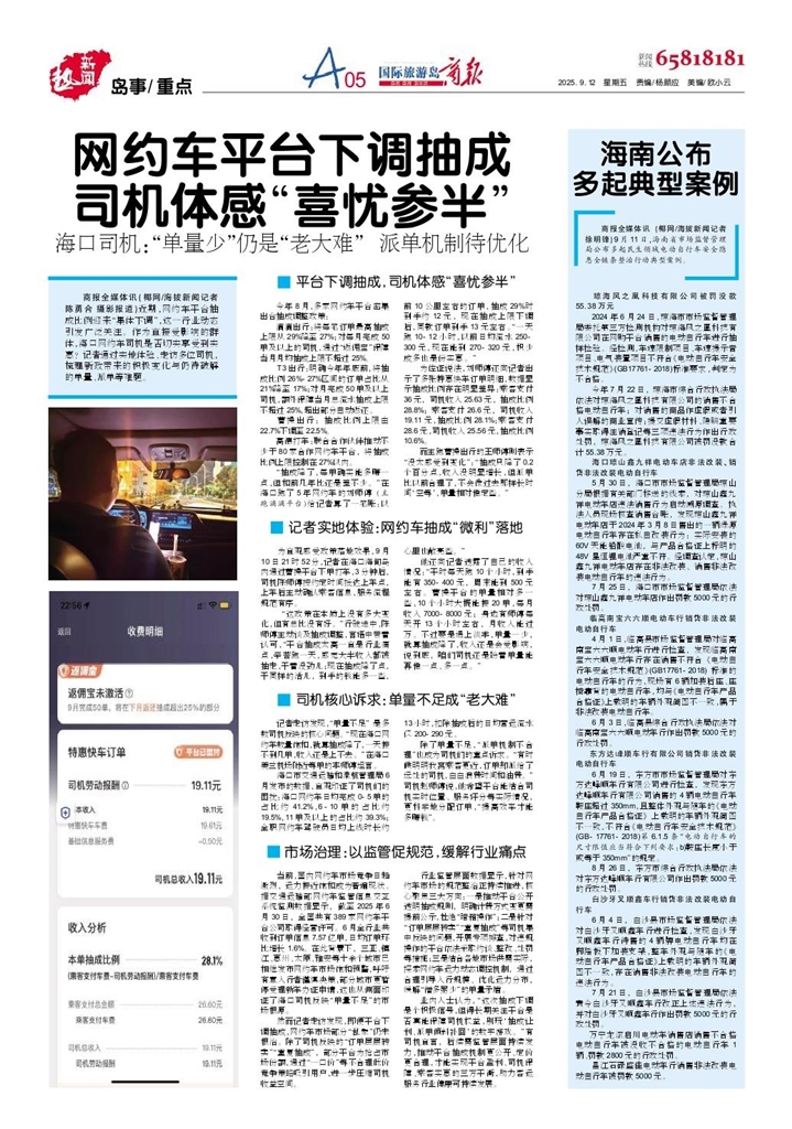 商报全媒体讯(椰网/海拔新闻记者 陈勇合 摄影报道)近期,网约车平台抽成比例迎来“集体下调”,这一行业动态引发广泛关注。作为直接受影响的群体,海口网约车司机是否切实享受到实惠?记者通过实地体验、走访多位司机,梳理新政带来的积极变化与仍待破解的单量、派单等难题。