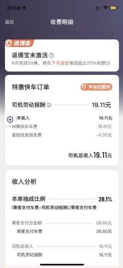 为佐证说法,刘师傅还向记者出示了多张特惠快车订单明细,数据显示抽成比例存在明显差异:乘客支付36元,司机收入25.63元,抽成比例28.8%;乘客支付26.6元,司机收入19.11元,抽成比例28.1%;乘客支付28.6元,司机收入25.56元,抽成比例10.6%。