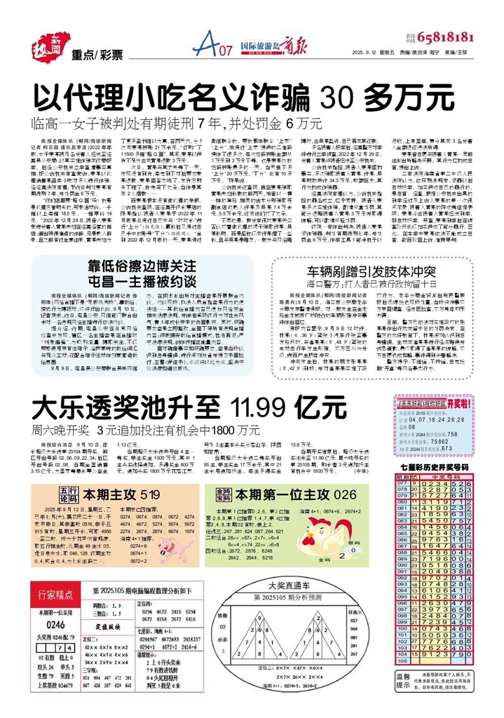 - 本期主攻519 2025年9月12日,星期五,乙巳年七月(大),属农历二十一日,干支甲申日,其申基数0516,申子丑915有数,星期五开彩,可取4956一至二数。按六十花甲纳音规律,取五行相生数,此期金49生水0