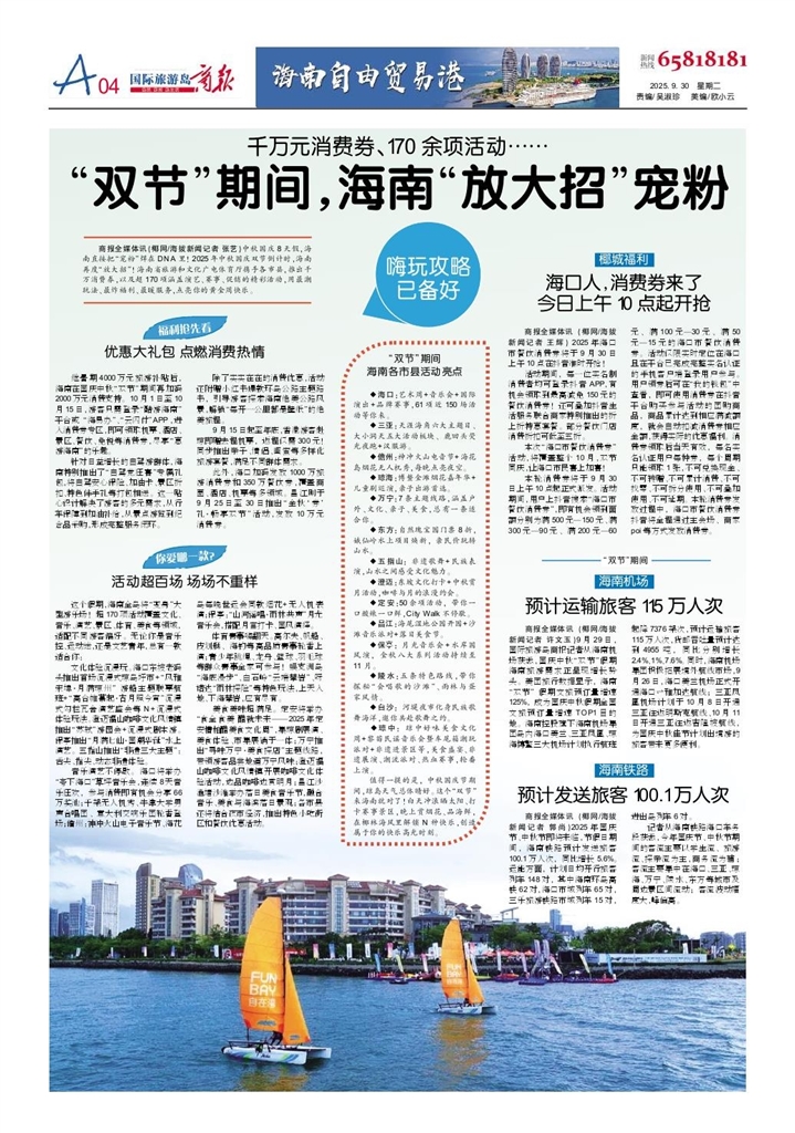 商报全媒体讯(椰网/海拔新闻记者 张艺)中秋国庆8天假,海南直接把“宠粉”焊在DNA里!2025年中秋国庆双节倒计时,海南再度“放大招”!海南省旅游和文化广电体育厅携手各市县,推出千万消费券,以及