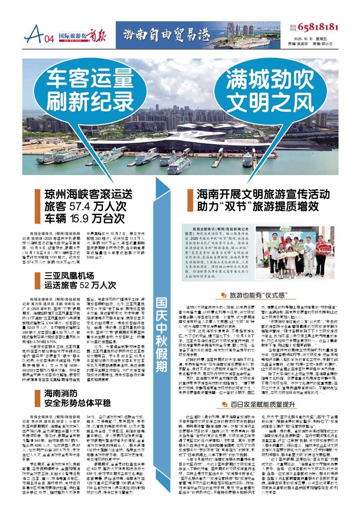 - 海南开展文明旅游宣传活动助力“双节”旅游提质增效 商报全媒体讯(椰网/海拔新闻记者 张艺)椰风送爽迎佳节,暖心服务伴旅途。2025年国庆中秋“双节”期间,由海南省旅游和文化广电体育厅主办、海南省旅游协会承办的“酷游海南,暖心护航”暨“党员亮身份