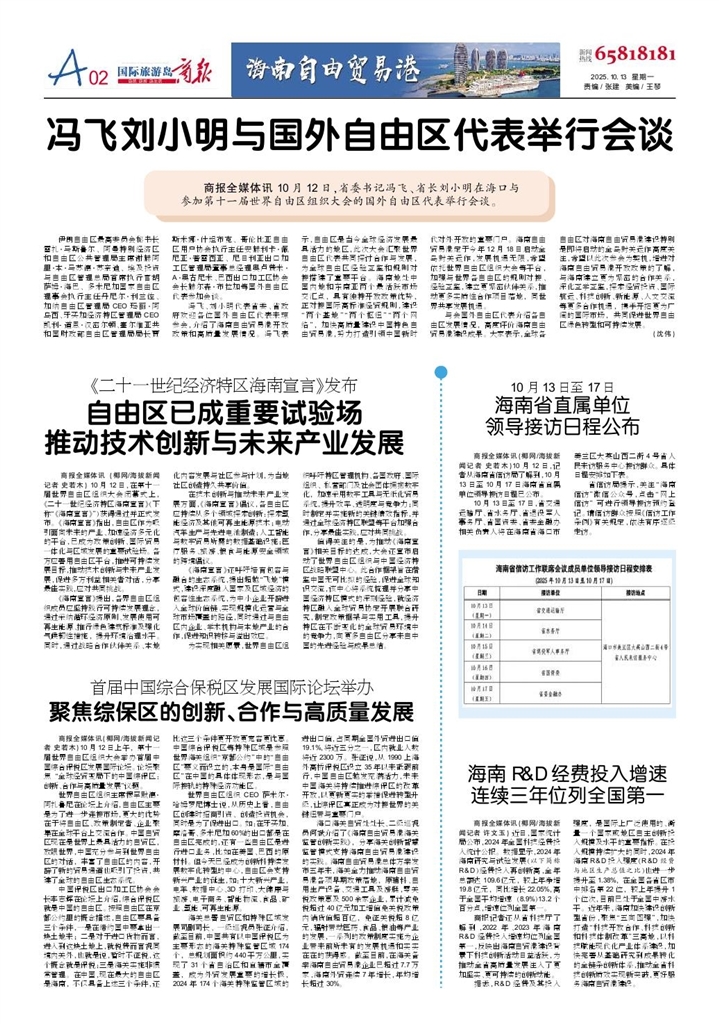 - 自由区已成重要试验场 推动技术创新与未来产业发展 商报全媒体讯(椰网/海拔新闻记者 史若木) 10月12日,在第十一届世界自由区组织大会闭幕式上,《二十一世纪经济特区海南宣言》(下称“《海南宣言》”)获得通过并正式发布。《海南宣言》指出,自由区作