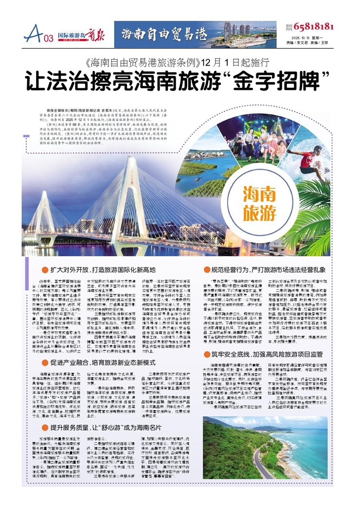 商报全媒体讯(椰网/海拔新闻记者 史若木)近日,海南省第七届人民代表大会常务委员会第二十次会议审议通过《海南自由贸易港旅游条例》(以下简称《条例》)。该条例自2025年12月1日起施行,《海南省旅