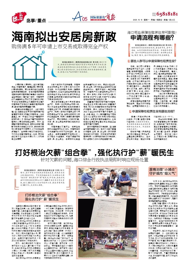 - 打好根治欠薪“组合拳” ,强化执行护“薪”暖民生 商报全媒体讯(椰网/海拔新闻记者 王辉)10月10日,海口市综合行政执法局党组成员、副局长宋佐上线《椰城纠风》。节目现场播出短片《打好根治欠薪“组合拳” 强化执行护“薪”暖民生》中反映,海南古悦嘉