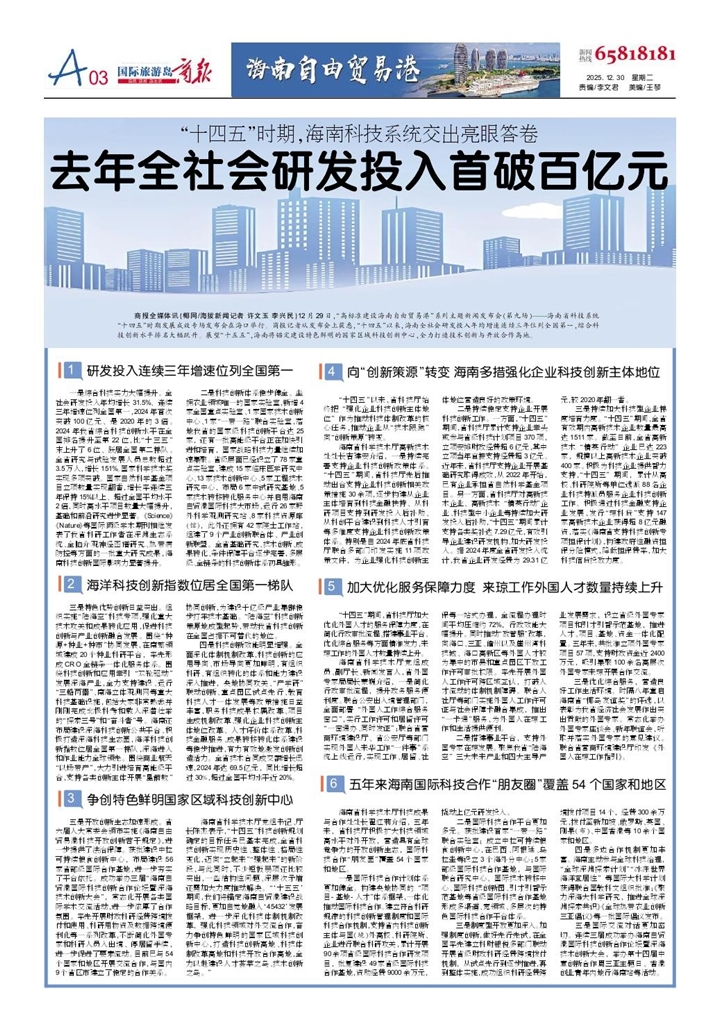 商报全媒体讯(椰网/海拔新闻记者 许文玉 李兴民)12月29日,“高标准建设海南自由贸易港”系列主题新闻发布会(第九场)——海南省科技系统“十四五”时期发展成效专场发布会在海口举行。商报记者从发布